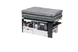 Den brede seng foldes nemt ud og leveres med madras og puder, så du hurtigt kan gå fra køretur til hvile. Sengelængden kan justeres, så opsætningen kan tilpasses både plads og behov.